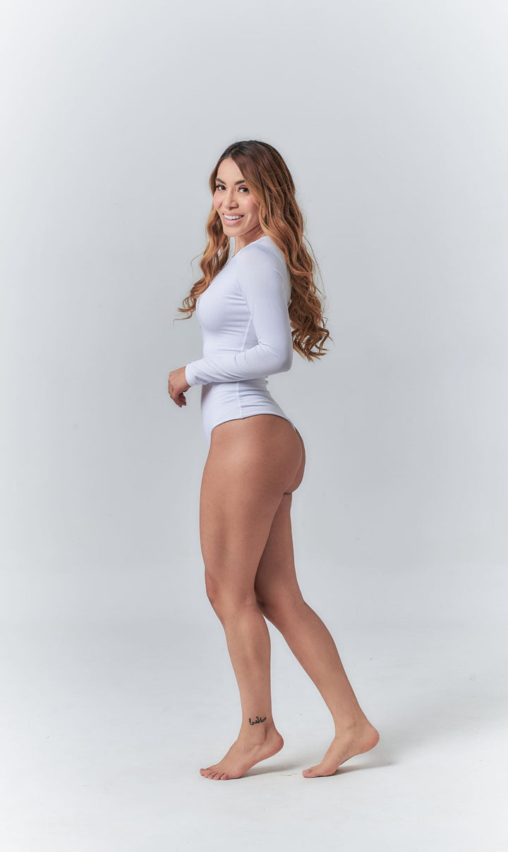 Este body de manga larga con cuello redondo ha sido confeccionado con tela doble en la parte delantera y posterior, brindando una sensación de firmeza y un acabado impecable que realza la silueta.