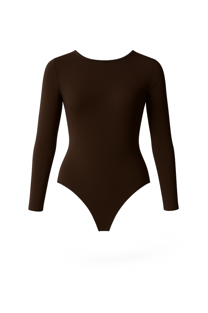 Este body de manga larga con cuello redondo ha sido confeccionado con tela doble en la parte delantera y posterior, brindando una sensación de firmeza y un acabado impecable que realza la silueta.