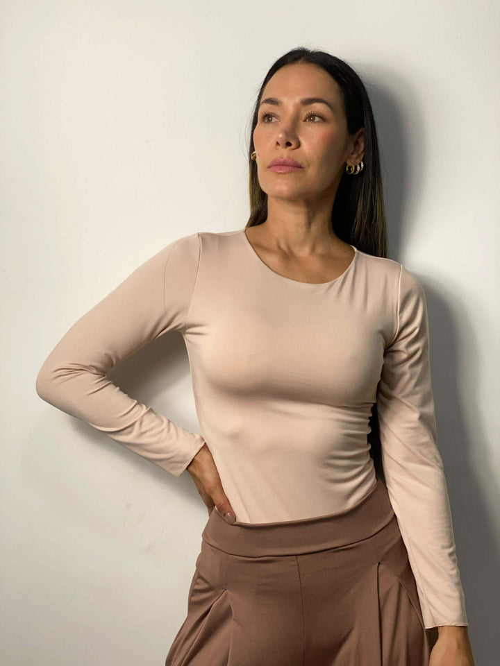 Este body de manga larga con cuello redondo ha sido confeccionado con tela doble en la parte delantera y posterior, brindando una sensación de firmeza y un acabado impecable que realza la silueta.