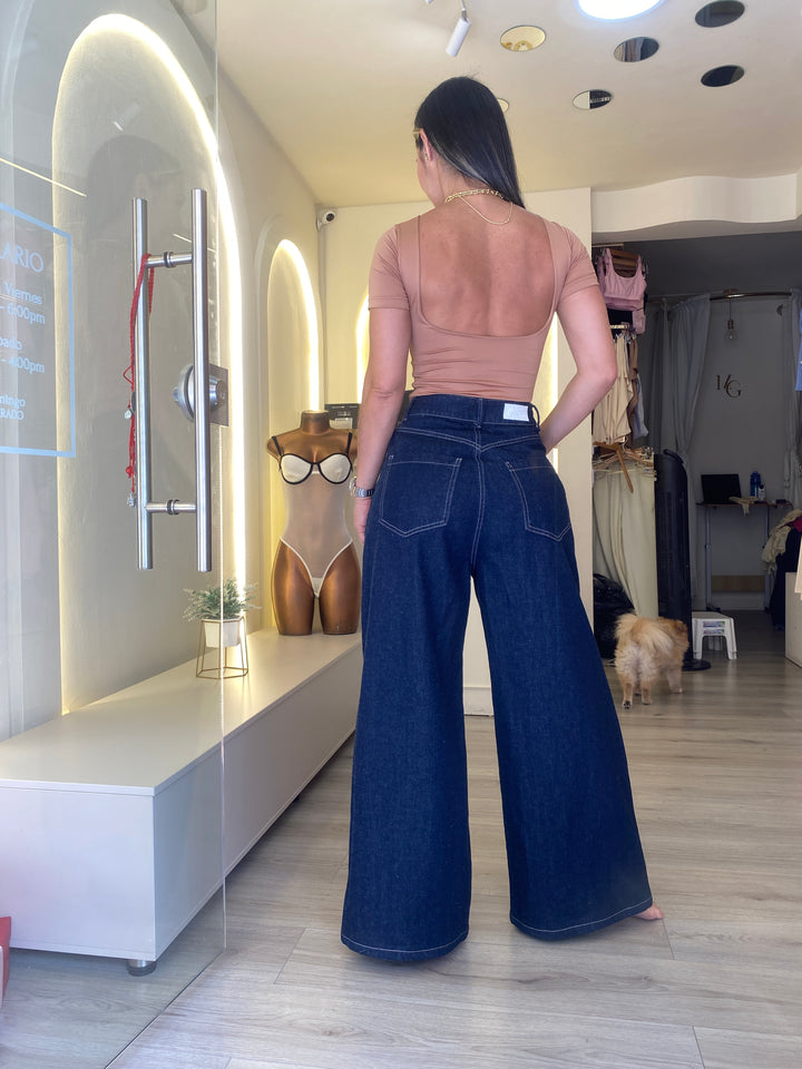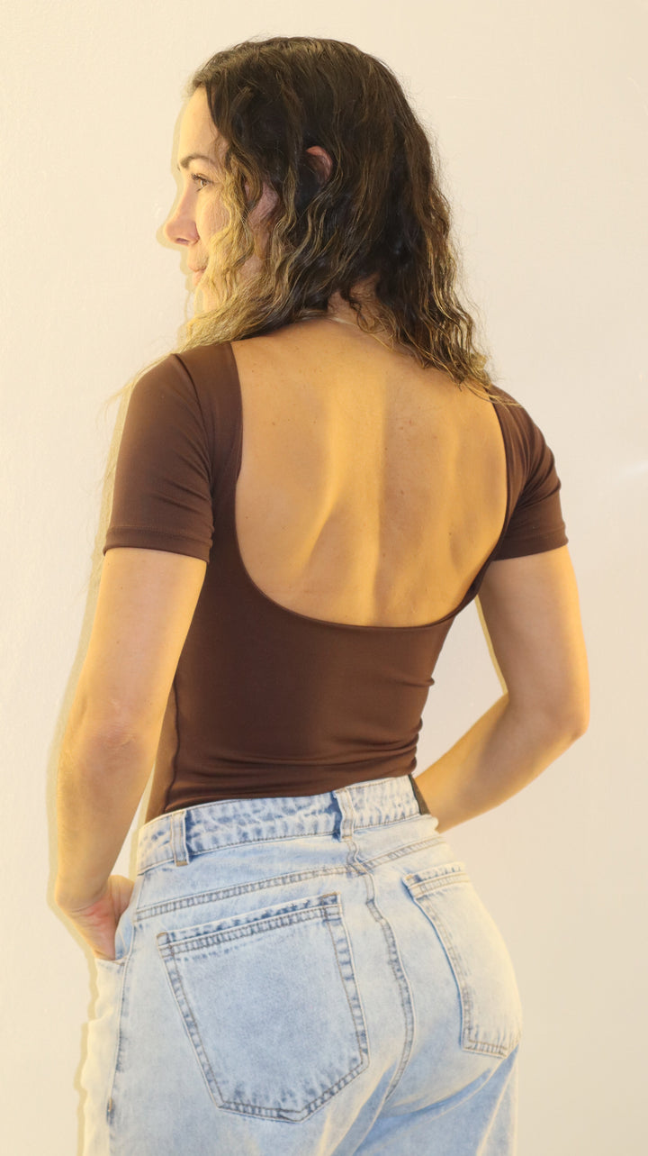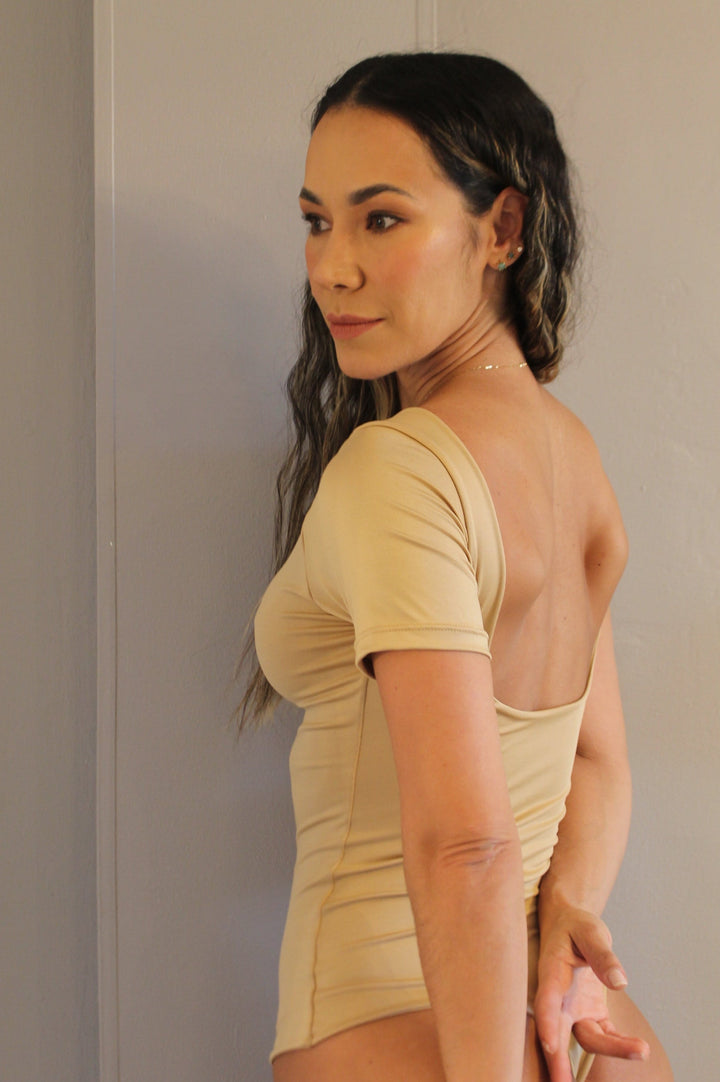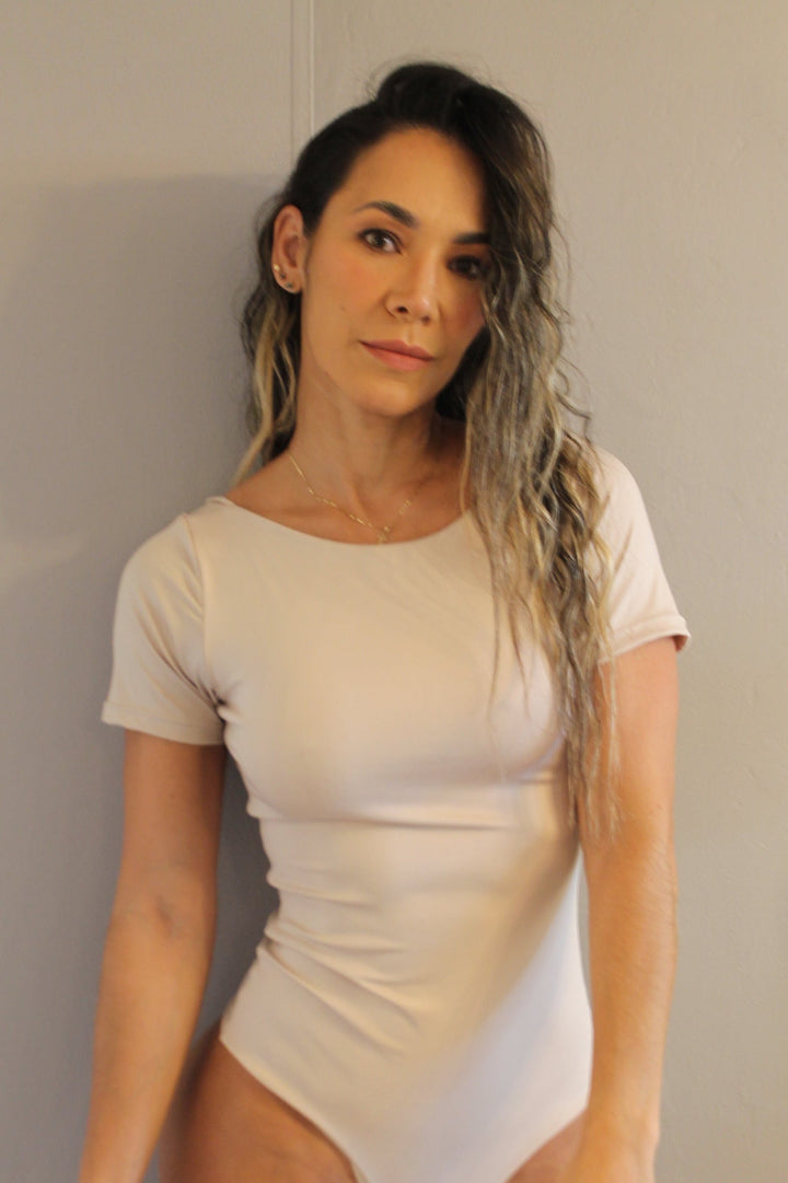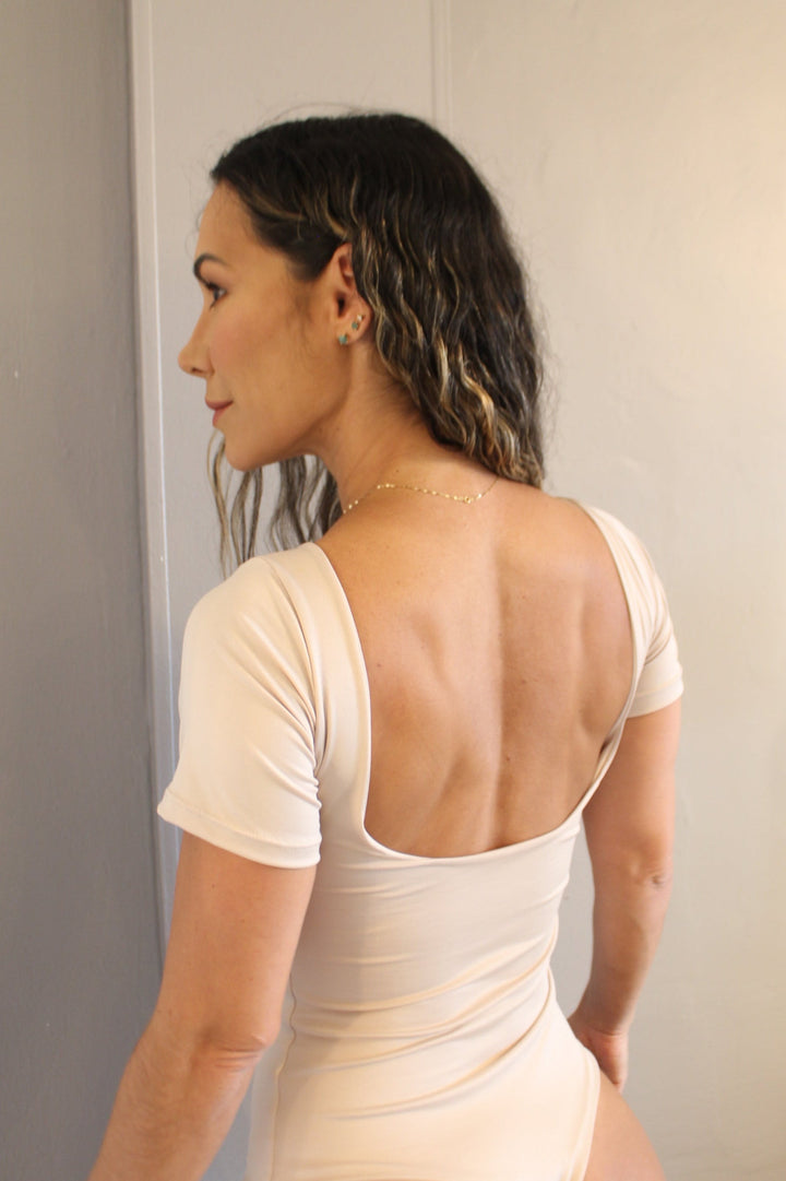 Este body de manga corta con cuello redondo y espalda destapada ha sido confeccionado con tela doble en la parte delantera y posterior, brindando una sensación de firmeza y un acabado impecable que realza la silueta.