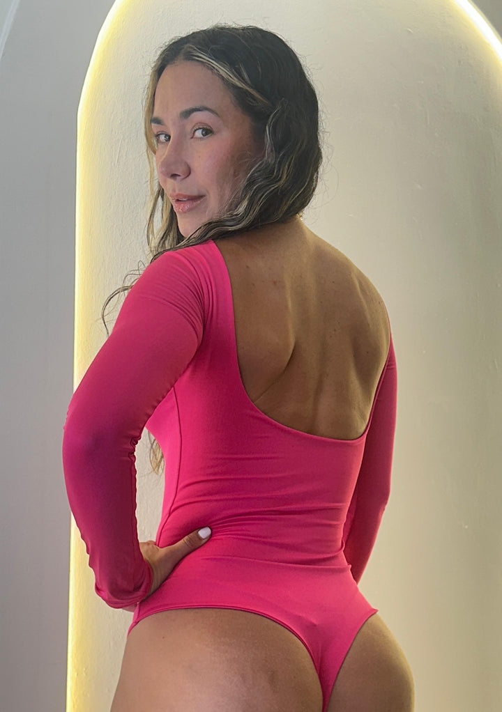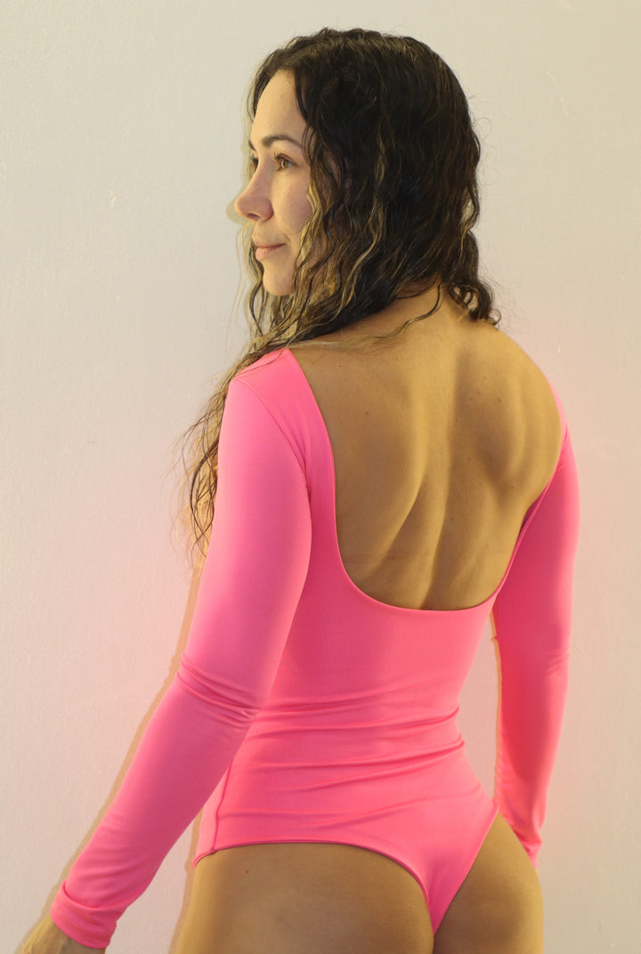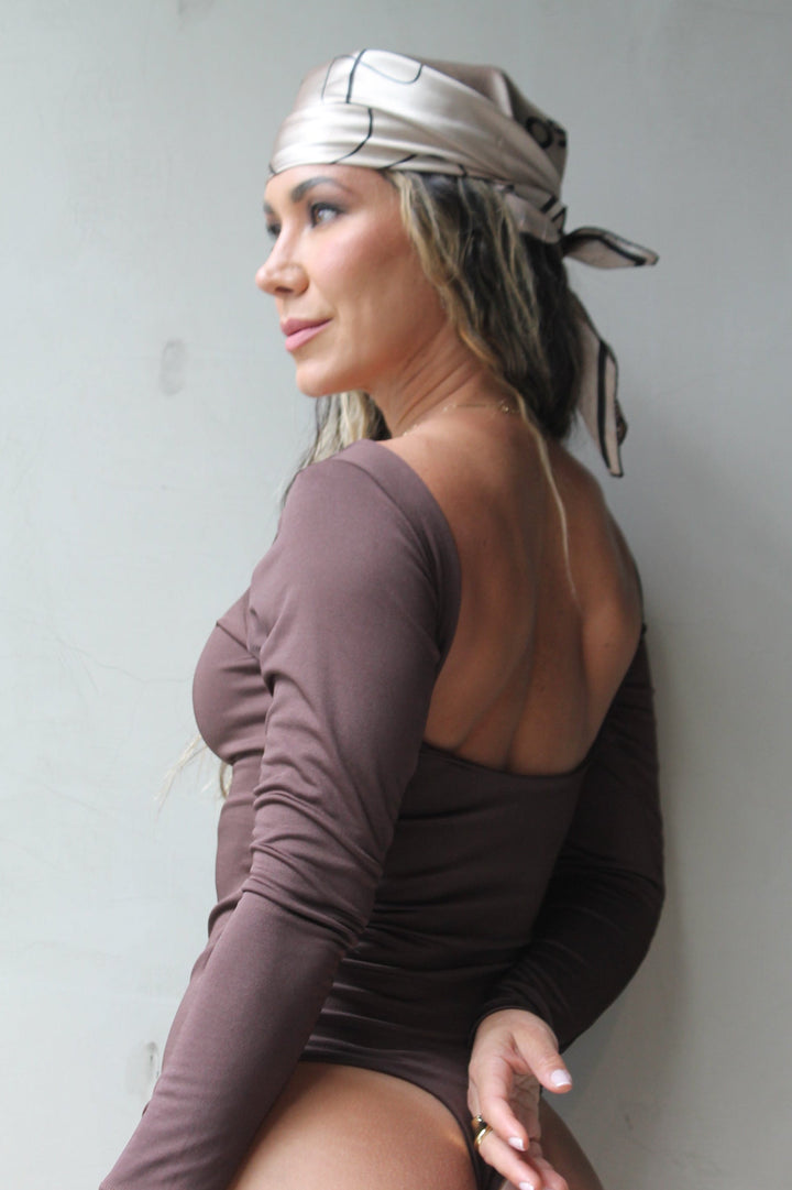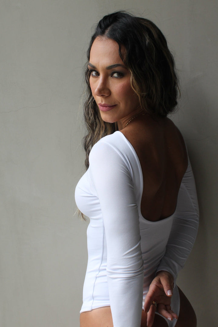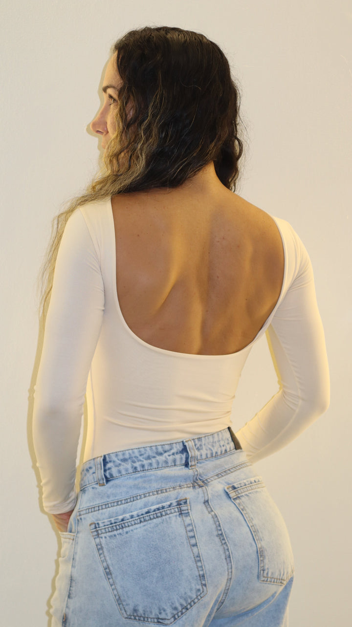 Este body de manga larga con cuello redondo y espalda destapada ha sido confeccionado con tela doble en la parte delantera y posterior, brindando una sensación de firmeza y un acabado impecable que realza la silueta.