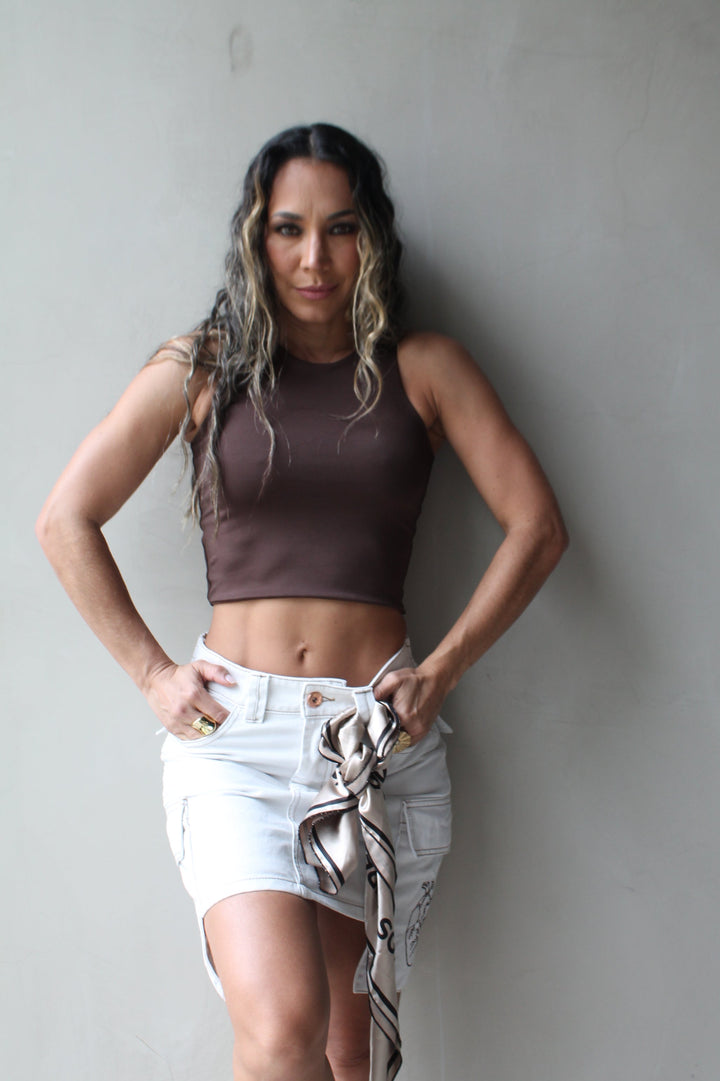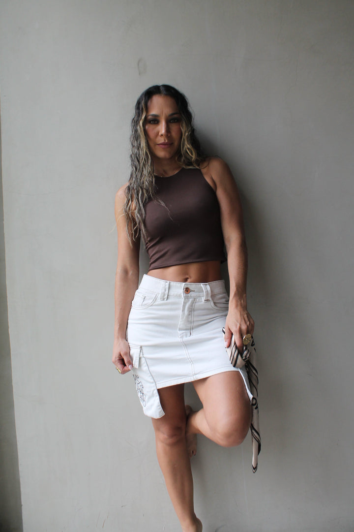 Nuestra falda en tela de jean con pedrería en los costados, sus bolsillos alargados la hacer diferente a lo convencional. es absolutamente divina, lleva nuestro corazón en piedra que representa lo que somos como mujeres.