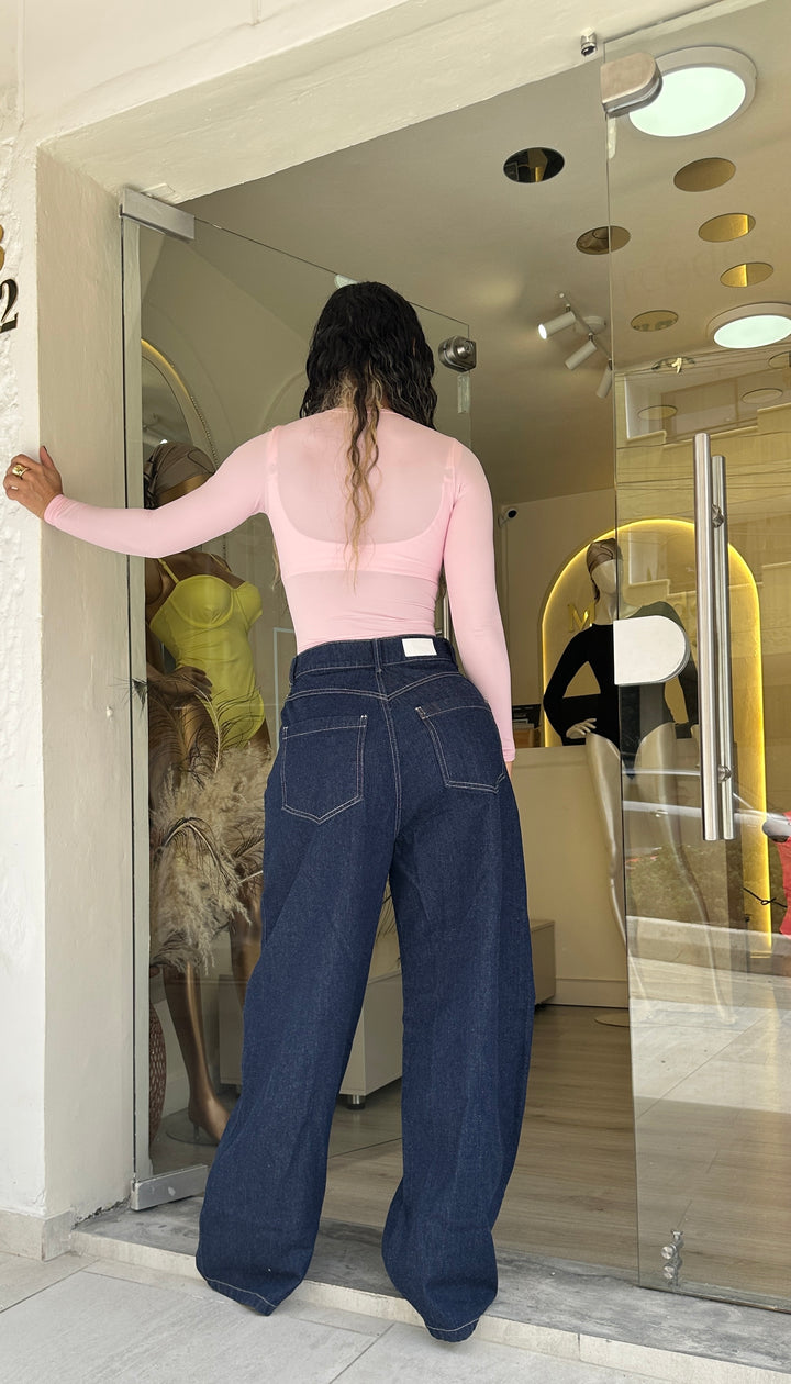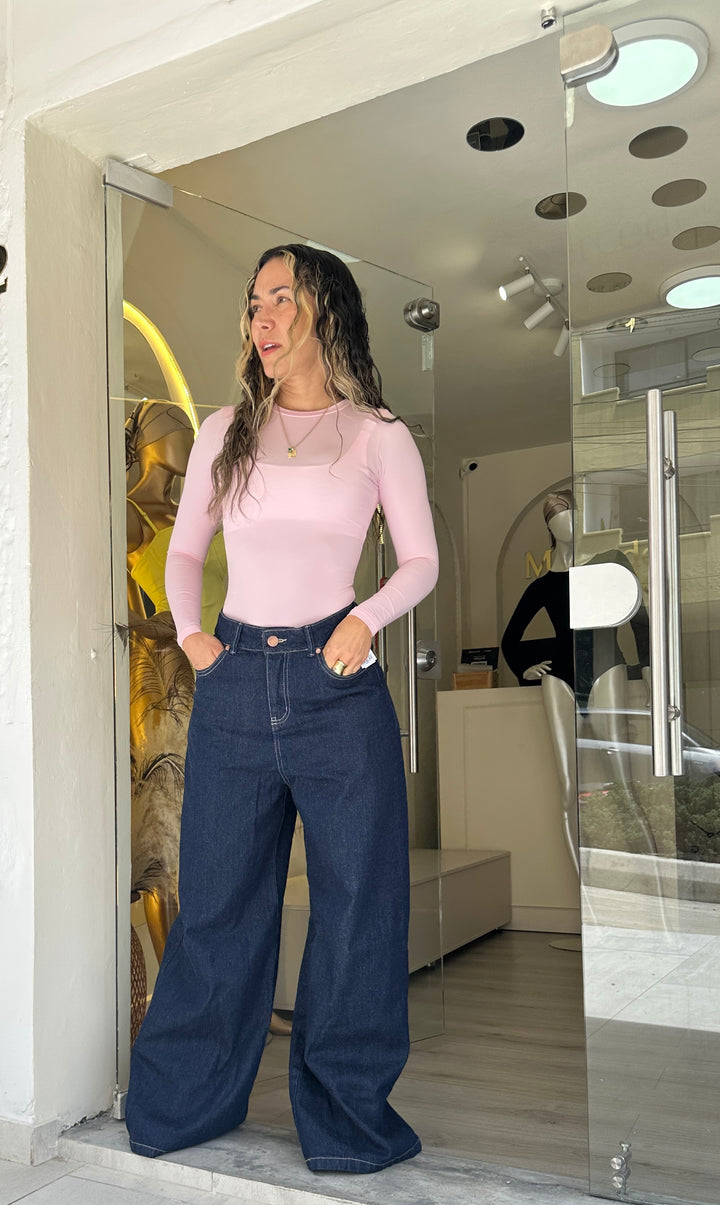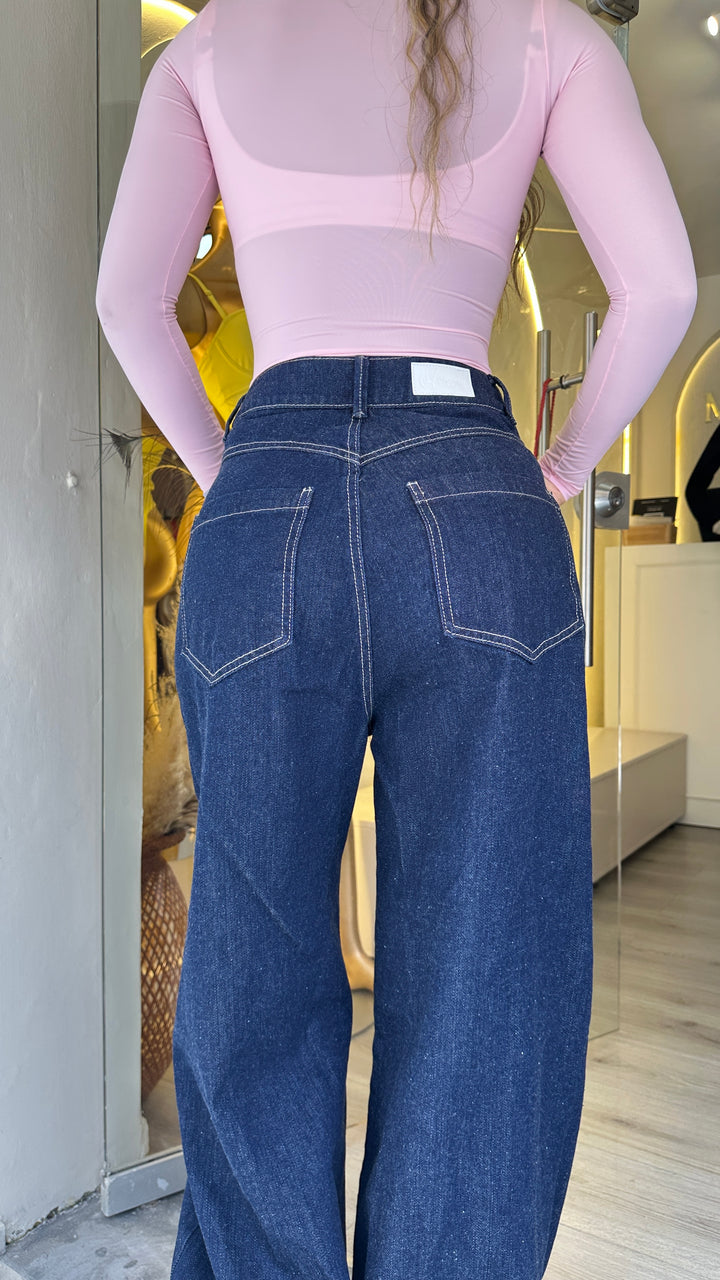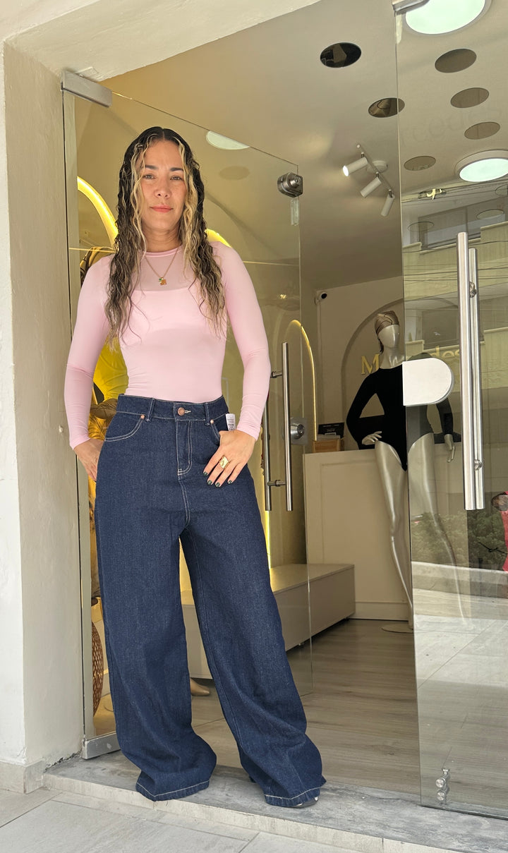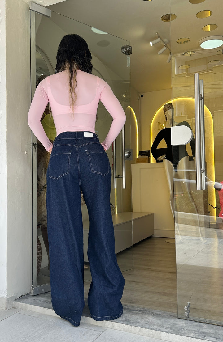 Jean pretina alta y bota ancha tipo palazzo en azul indigo