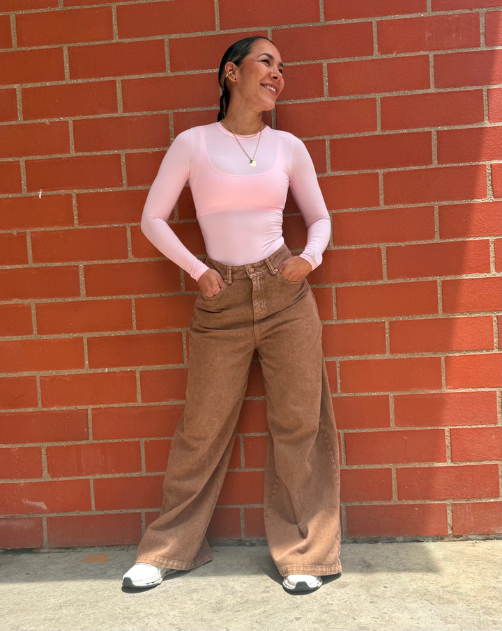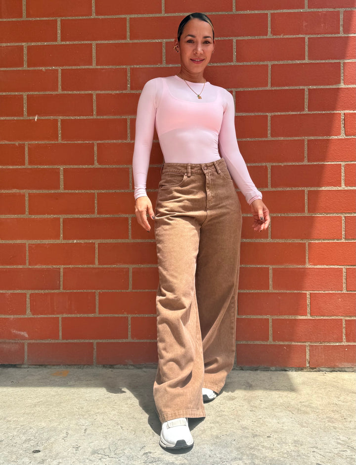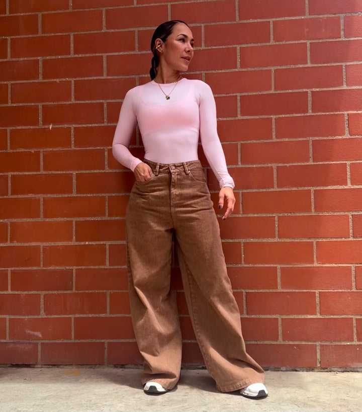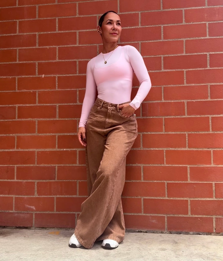 Jean pretina alta y bota ancha tipo palazzo, cintura pequeña y cadera ancha.
