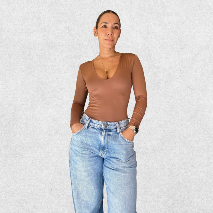 Este body de manga larga con cuello en V escote profundo ha sido confeccionado con tela doble en la parte delantera y posterior, brindando una sensación de firmeza y un acabado impecable que realza la silueta.