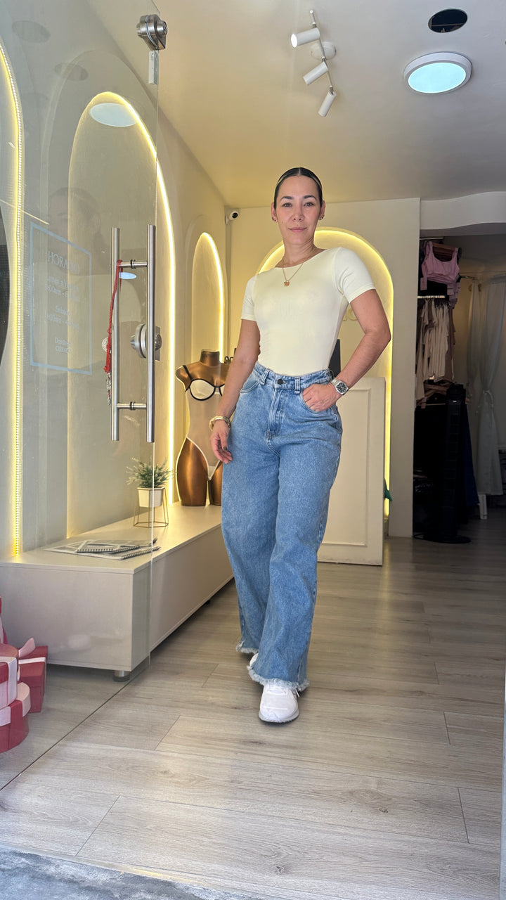 Este body de manga corta con cuello redondo y espalda destapada ha sido confeccionado con tela doble en la parte delantera y posterior, brindando una sensación de firmeza y un acabado impecable que realza la silueta.